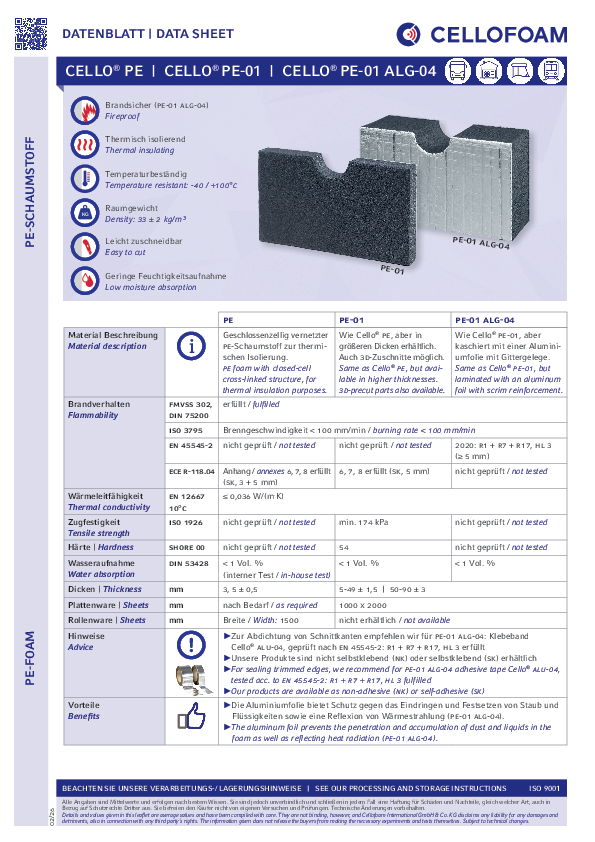 Geschlossenzelliger, vernetzter PE-Schaum. Cello® PE-01 überzeugt durch sein niedriges Gewicht sowie die geringe Feuchtigkeitsaufnahme.