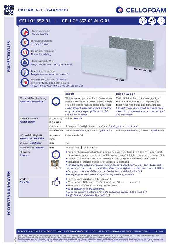 Bílé, pevné, samozhášivé polyesterové rouno. Výhody Cello® 852-01: vysoká tvrdost, vysoká mechanická pevnost a vysoká teplotní stabilita.
