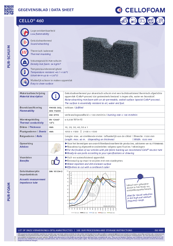 PUR-schuim met een luchtdoorlatend afgedicht oppervlak. Cello® 460 kenmerkt zich door een vuilafstotend, waterafstotend en gemakkelijk te reinigen oppervlak.