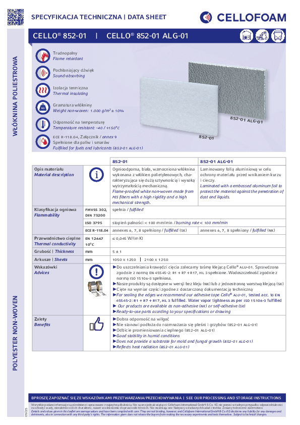 Biała, ognioodporna włóknina ze 100% poliestru. Zaletą Cello® 852-01 jest niespotykana sztywność oraz wytrzymałość mechaniczna, jak również wysoka odporność na temperaturę.