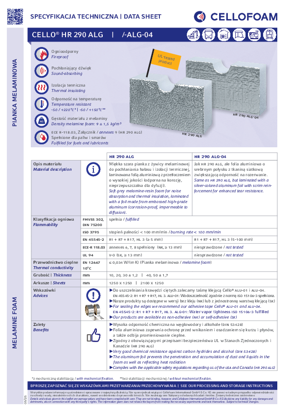 Tworzywo piankowe na bazie żywicy melaminowej (Basotect®) o siatkowanej powierzchni aluminiowej dla wyższej odporności na zerwanie. Zaletą Cello® HR 290 ALG-04 jest doskonała odporność ogniowa oraz szczelność na olej, wodę i paliwa.