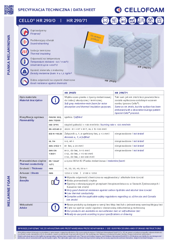 Jasnoszare tworzywo piankowe na bazie żywicy melaminowej (Basotect®). Zaletą Cello® HR 290/O jest wysoka możliwość pochłaniania dźwięku, jak również duża odporność na wysokie temperatury i odporność ogniowa.