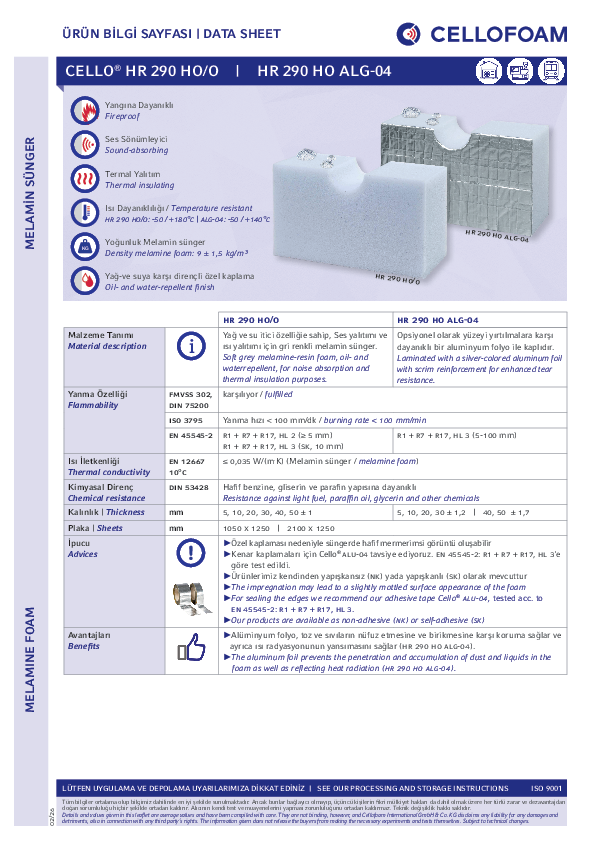 Melamin bazlı yumuşak sünger (Basotect®'den), yağ ve su itici özellikleriyle. Cello® HR 290 HO ALG-04, ayrıca yırtılma direncini arttırmak için alüminyum folyo ile lamine edilir.