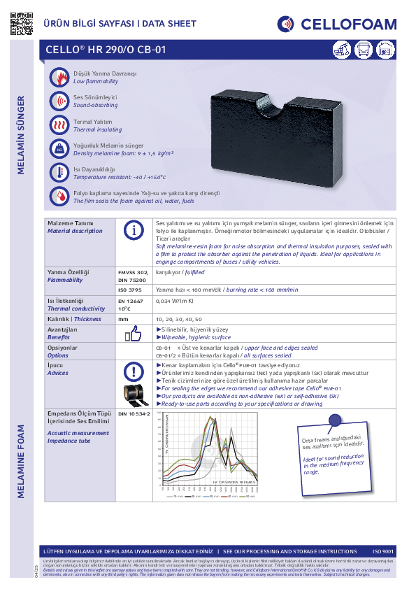 Montaj yüzeyi dışındaki tüm yüzeyler folyo ile kaplanmış gri renkli süngerdir. Cello® HR 290/O CB-01 yağ, su ve yakıta karşı dirençlidir,ayrıca yüksek yangın gereksinimlerini karşılamaktadır