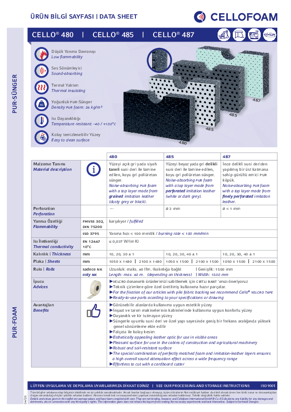 Delikli suni deri ile lamine elimiş poliüretan bir süngerdir. Cello® 485 estetik görünüşünün yanında silinebilir özellikte yüzeye sahiptir.