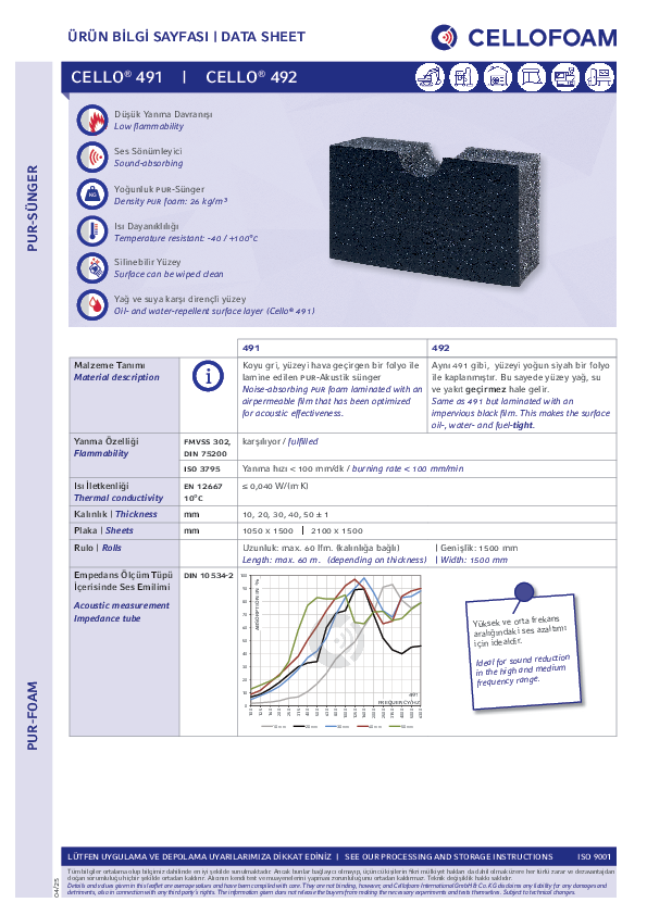 Yüzeyi ince bir folyo(siyah) ile lamine edilen Poliüretan bir süngerdir. Cello® 491, yağ, su ve yakıt geçirmeyen yüzeyi sayesinde problemsizce silinebilir.